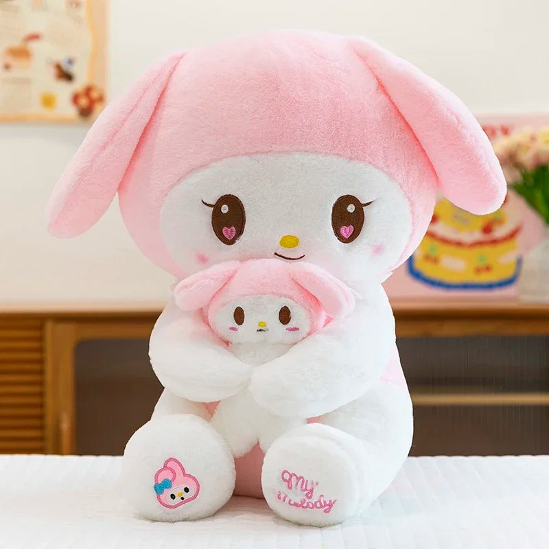 Craquez pour l’adorable My Melody tenant son mini doudou ! Une peluche douce, rassurante et parfaite pour décorer une chambre, offrir à un proche ou câliner pendant les soirées cocooning 💖